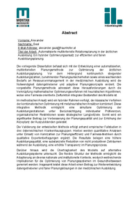 Abstract Vorname: Alexander Nachname: Gaal E-Mail-Adresse: alexander.gaal@fraunhofer.at Titel der Arbeit: Automatisierte multikriterielle Rotationsplanung in der ärztlichen Ausbildung: Ein hybrider…