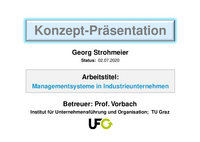 Konzept-Präsentation Georg Strohmeier Status: 02.07.2020 Arbeitstitel: Managementsysteme in Industrieunternehmen Betreuer: Prof. Vorbach Institut für Unternehmensführung und Organisation; TU Graz …