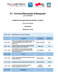 27. Techno-Ökonomie Kolloquium am 2.Juli 2020 Institut für Managementwissenschaften, TU Wien VIDEOKONFERENZ Programm 09:00 bis 12:45 09:00 - 09:15 Begrüßung durch Prof. Walter Schwaiger…